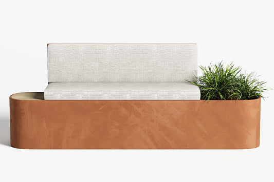 Organisch gevormde cortenstaal plantenbak met zit